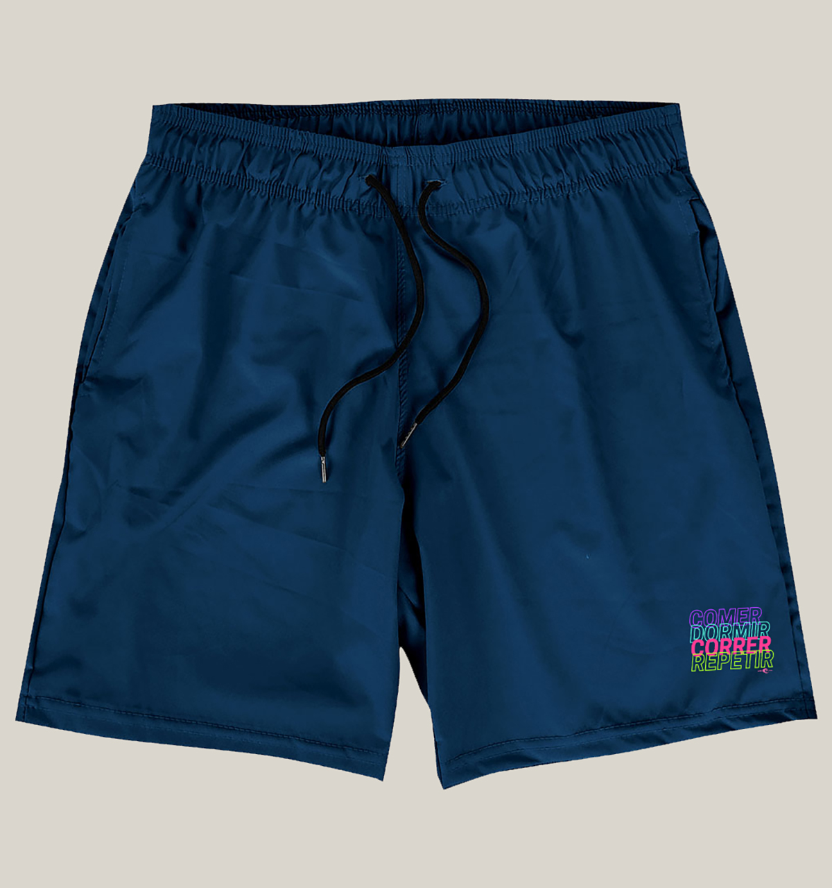 A Bermuda Academia Corrida Masculina Azul Elastano Premium Tactel WSS Brasil Run Rotina é ideal para quem busca uma peça versátil e cheia de estilo para suas atividades físicas. Esta bermuda academia e corrida masculina destaca-se pela estampa vibrante com as palavras "comer, dormir, correr e repetir" em cores roxo, azul claro, rosa e amarelo, que representam alegria e vitalidade, além de motivar para um estilo de vida saudável e ativo.