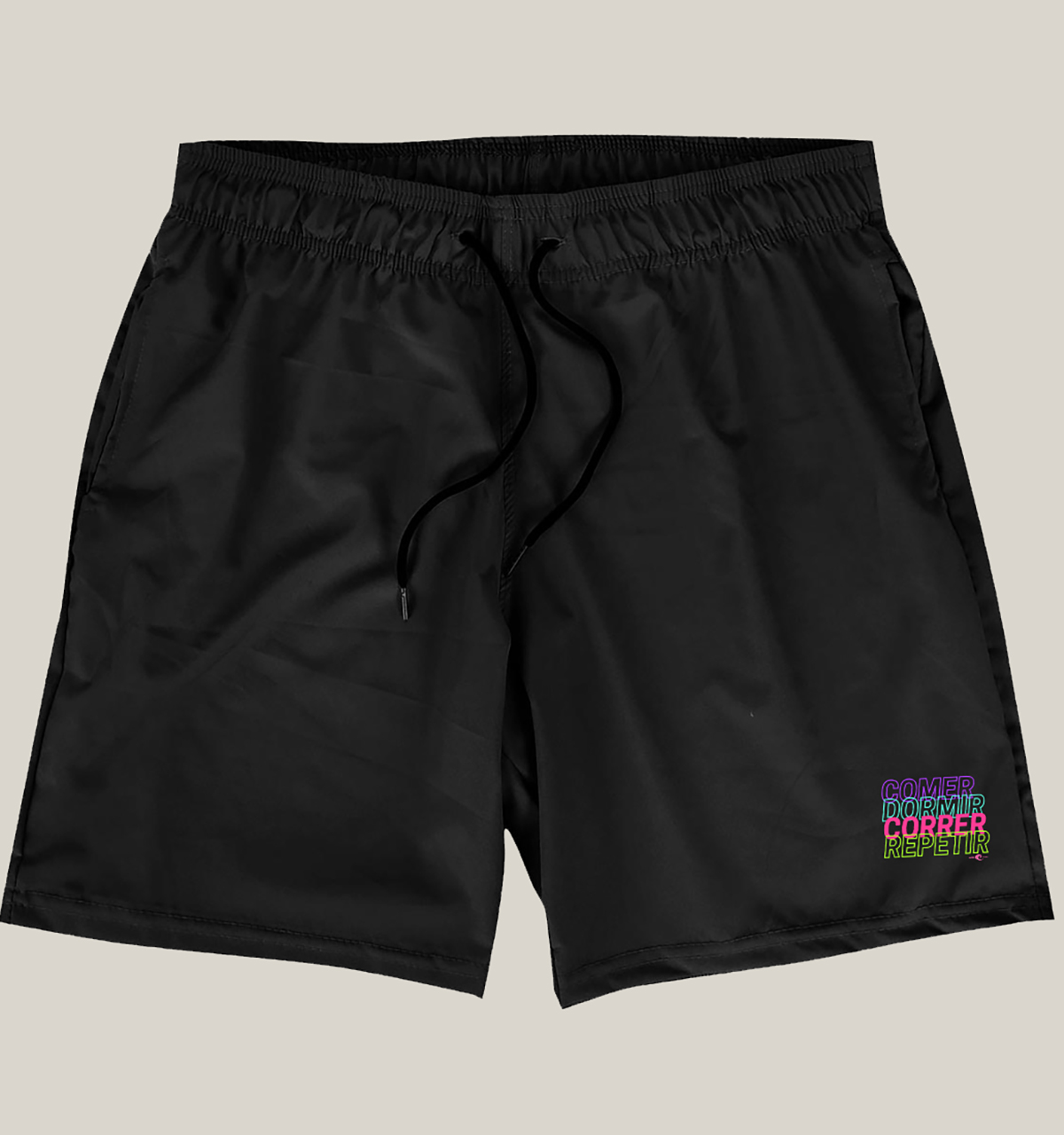 Estampa e Cores: Esta bermuda academia e corrida masculina possui uma estampa única com as palavras "comer, dormir, correr e repetir", destacadas em cores alegres e vibrantes como roxo, azul claro, rosa e amarelo. Essa estampa não só transmite uma mensagem de vitalidade e alegria, mas também celebra a rotina de quem adora manter um estilo de vida ativo. A cor preta da bermuda é clássica e versátil, combinando facilmente com qualquer peça do seu guarda-roupa esportivo ou casual, e ressaltando a vivacidade das cores da estampa.